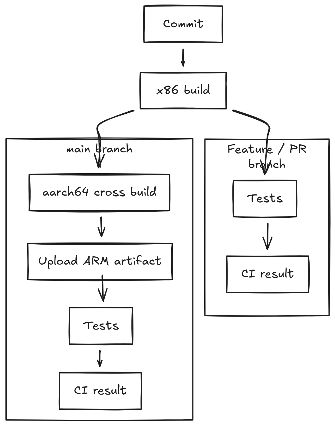 CI resources are limited, so build time needs to be used carefully. Running native x86 builds on GitHub Actions provides fast feedback from unit and integration tests without paying the overhead of container startup or invoking the aarch64 toolchain. For feature branches and routine development, this level of validation is sufficient and keeps the feedback loop short.