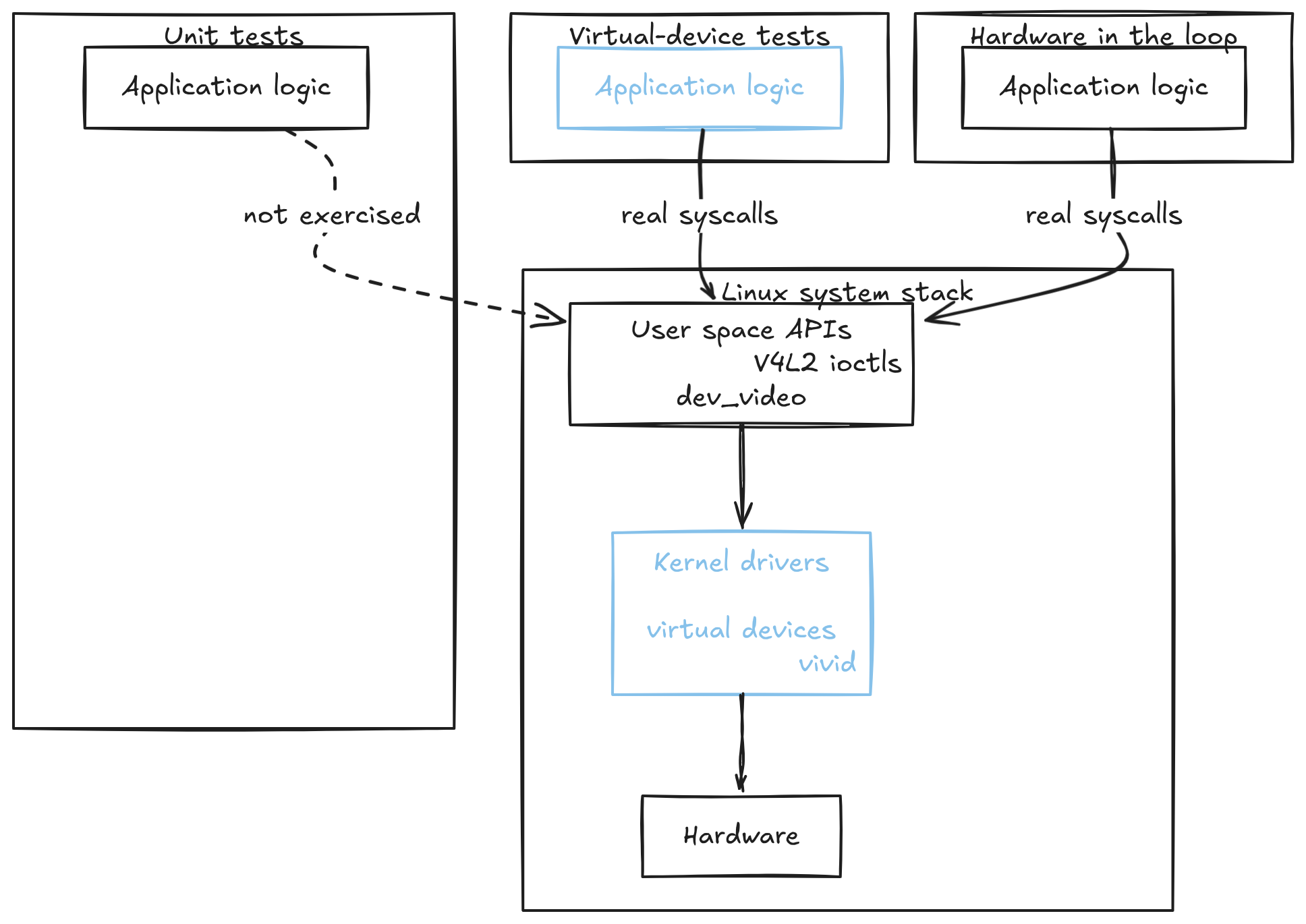 The diagram shows how coverage is distributed across a Linux video, or any other typical embedded system. Unit tests remain confined to application logic and never cross into the kernel. Hardware-in-the-loop testing exercises the full stack, but it sits outside the normal development loop and is expensive to run continuously. Virtual-device integration tests occupy the middle ground. They drive real syscalls and kernel code paths through emulated drivers, allowing the user-space-to-kernel boundary to be exercised early, repeatedly, and in CI, without relying on physical hardware.