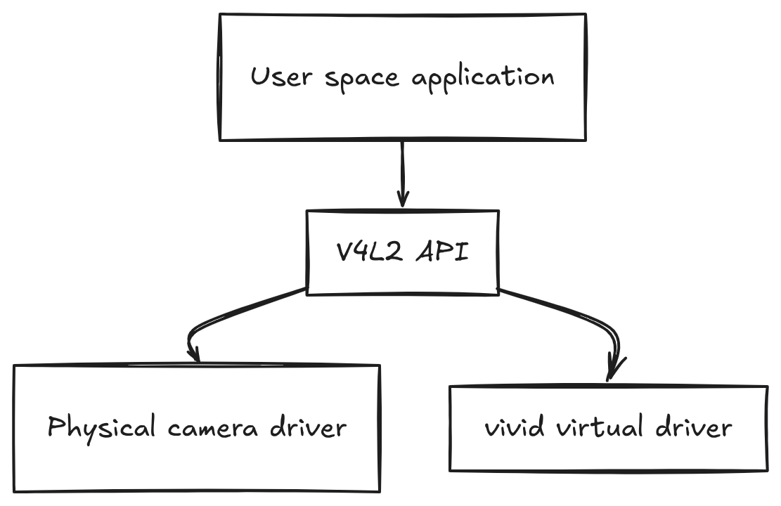 From user space, the application does not talk to hardware directly. It talks to the V4L2 API. Whether the request is handled by a physical camera driver or a virtual one is an implementation detail hidden behind the kernel interface.